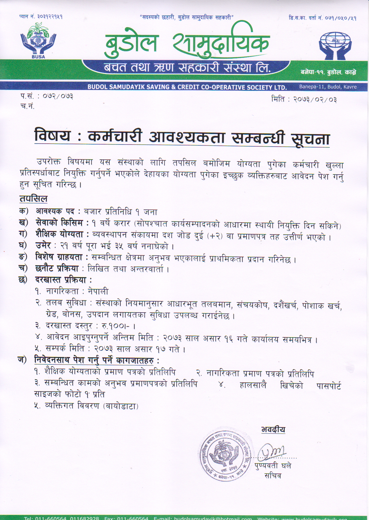 कर्मचारी आवश्यकतासम्बन्धी सूचना ।