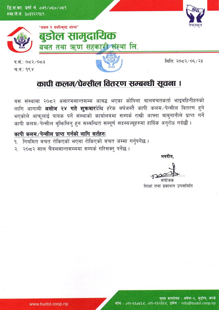 कापी कलम/पेन्सील वितरण सम्बन्धी सूचना ।