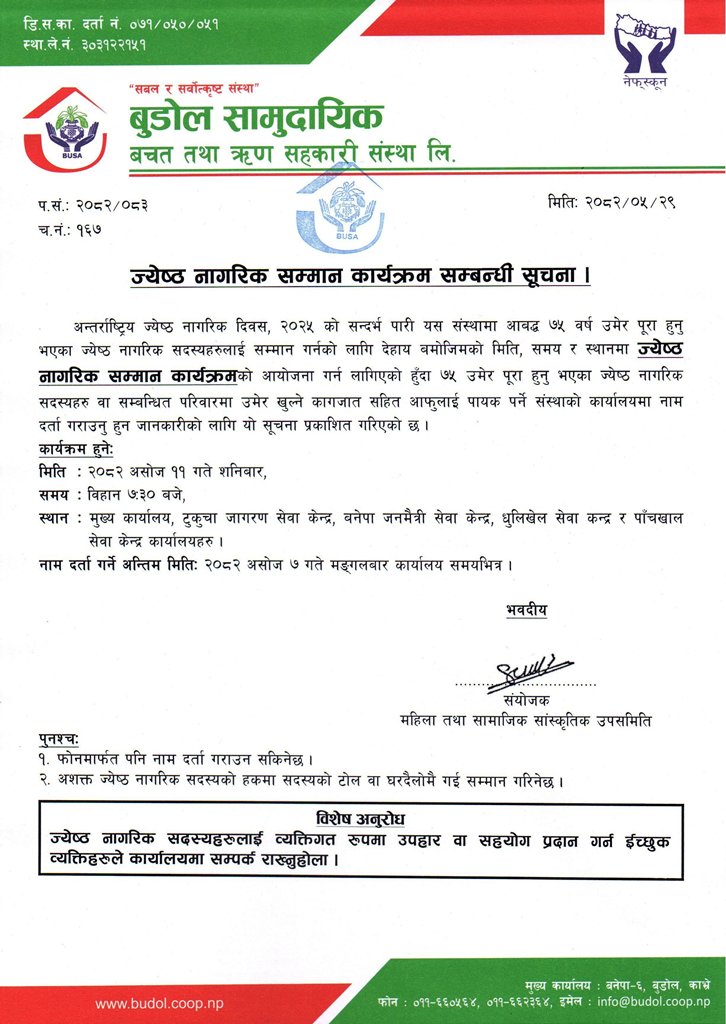 ज्येष्ठ नागरिक सम्मान कार्यक्रम सम्बन्धी सूचना ।