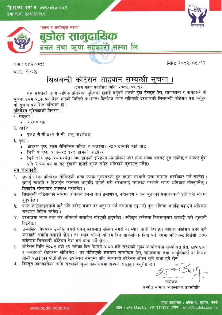 सिलबन्दी कोटेसन आह्वान सम्बन्धी सूचना ।