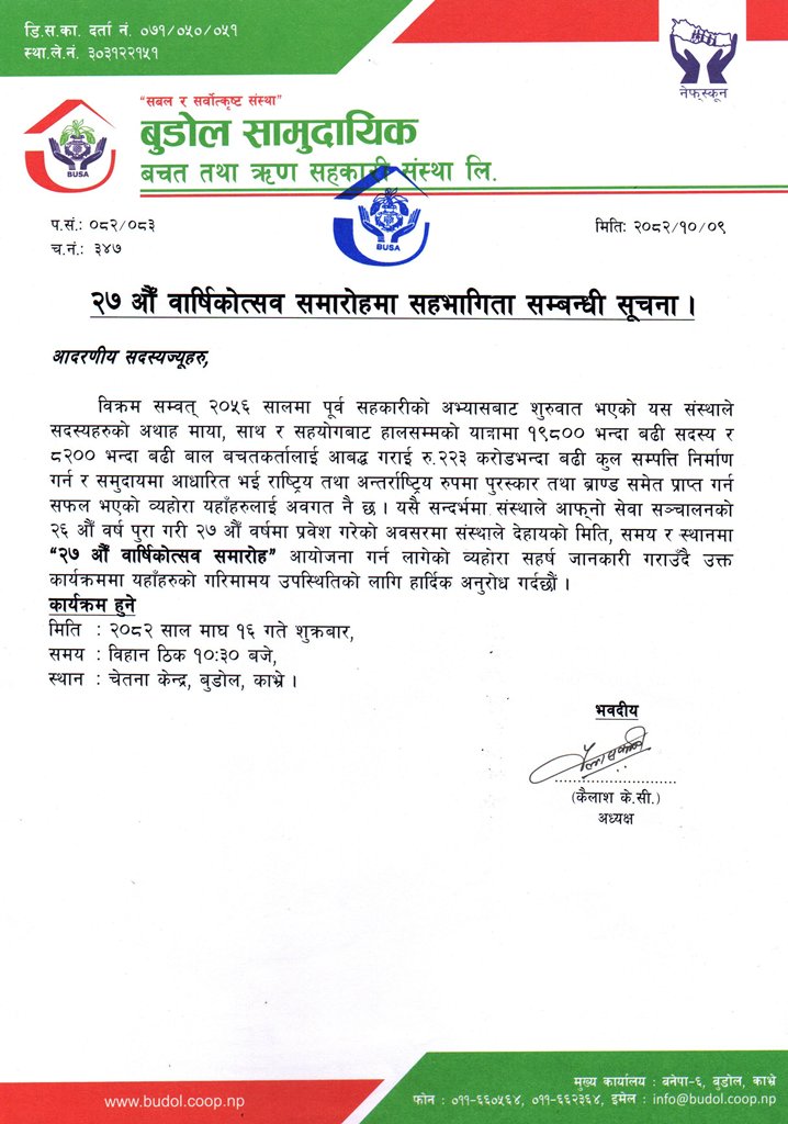 २७ औँ वार्षिकोत्सव समारोहमा सहभागिता सम्बन्धी सूचना ।